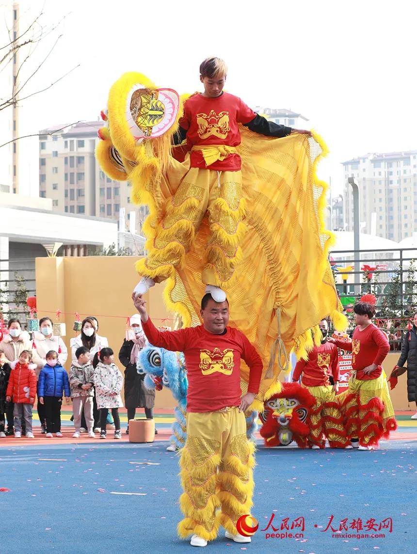 图为舞狮表演艺人表演高难度动作。人民网 李兆民 摄