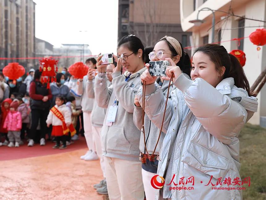 图为幼儿园老师们正在记录活动精彩瞬间。人民网 李兆民 摄