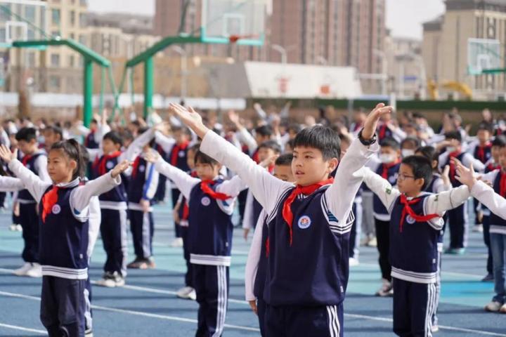 雄安新区容西片区云溪小学的学生在操场上做操(2023年3月23日摄)。新华社记者牟宇 摄