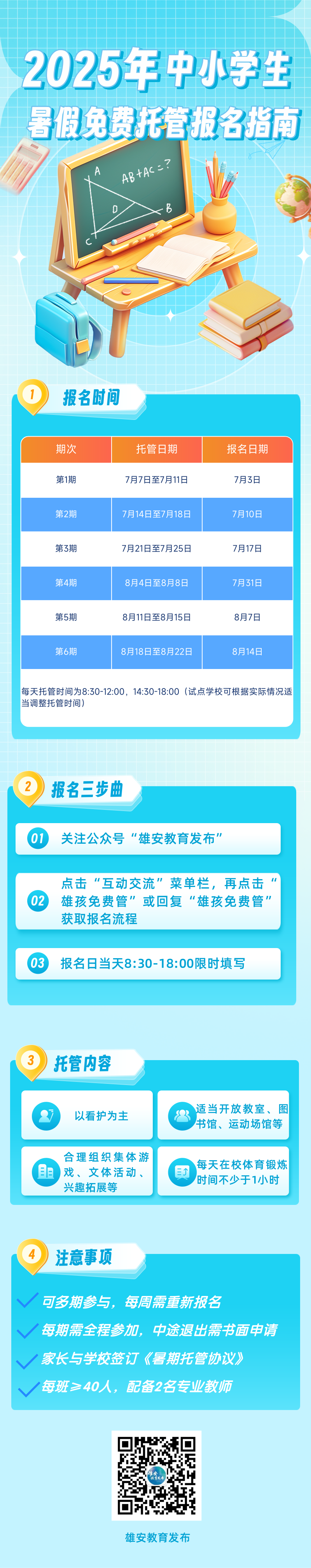 为更好服务疏解单位职工及新区群众子女,有效缓解中小学生假期“看护难”问题,切实减轻家长负担,引导和帮助中小学学生度过安全、快乐、有意义的暑假,2025年暑假免费托管将于7月7日正式开始。现将有关工作通知如下: