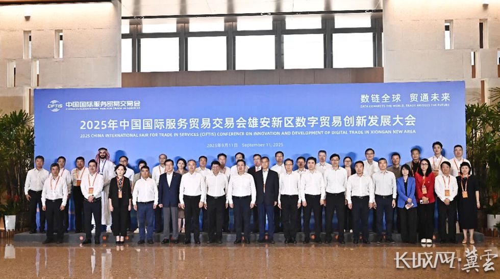 张国华与参加2025年中国国际服务贸易交易会雄安新区数字贸易创新发展大会的部分重要嘉宾合影。刘向阳摄