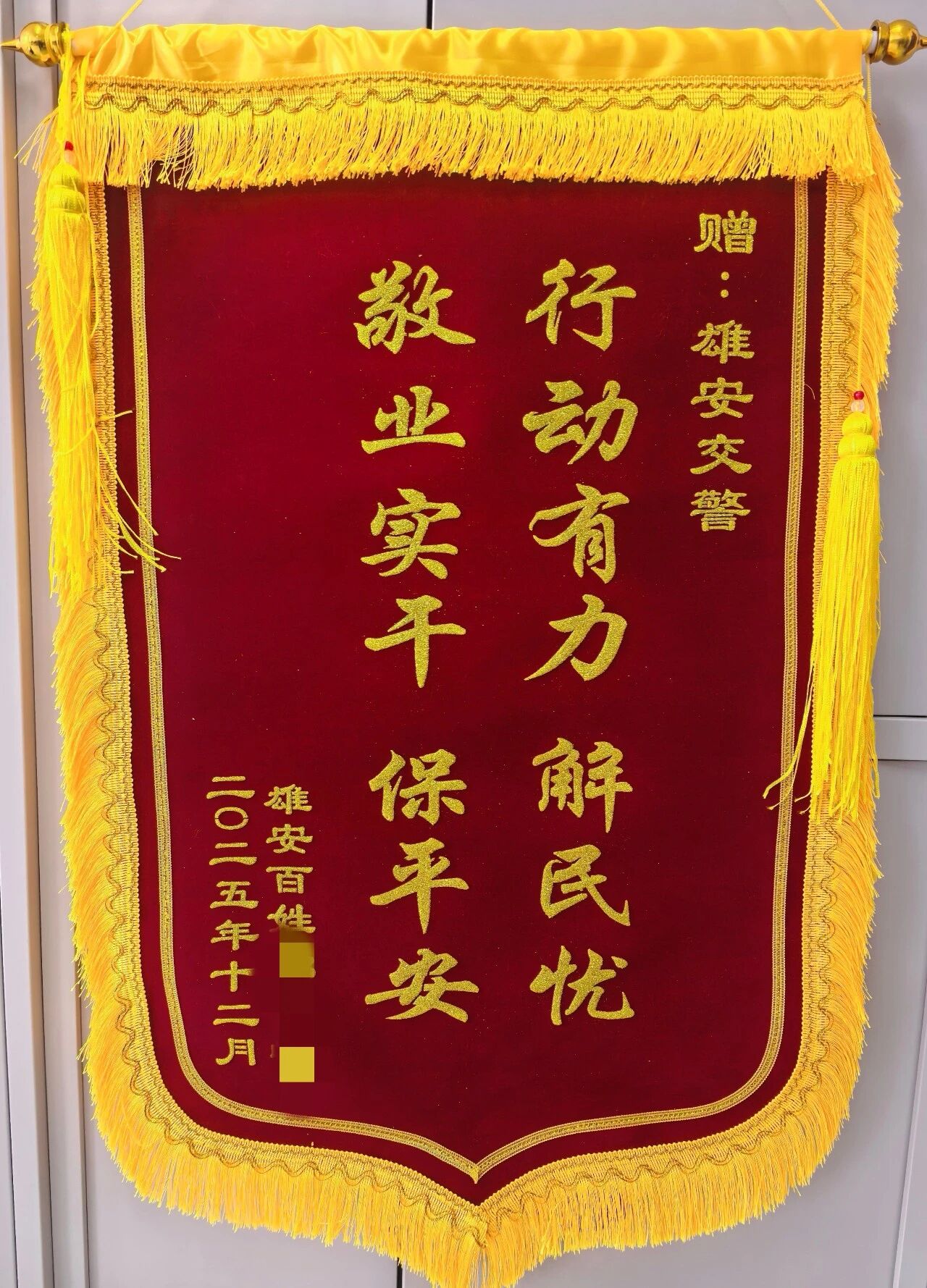 12月17日上午,一位中年男子来到雄安新区公安局门卫室,放下一面写有“行动有力 解民忧 敬业实干 保平安”的锦旗,再三叮嘱工作人员务必转交雄安交警后便匆匆离开。鲜红的锦旗上,字字句句饱含着群众对交警暖心救助的真挚谢意。