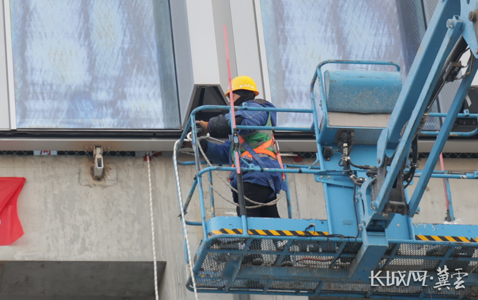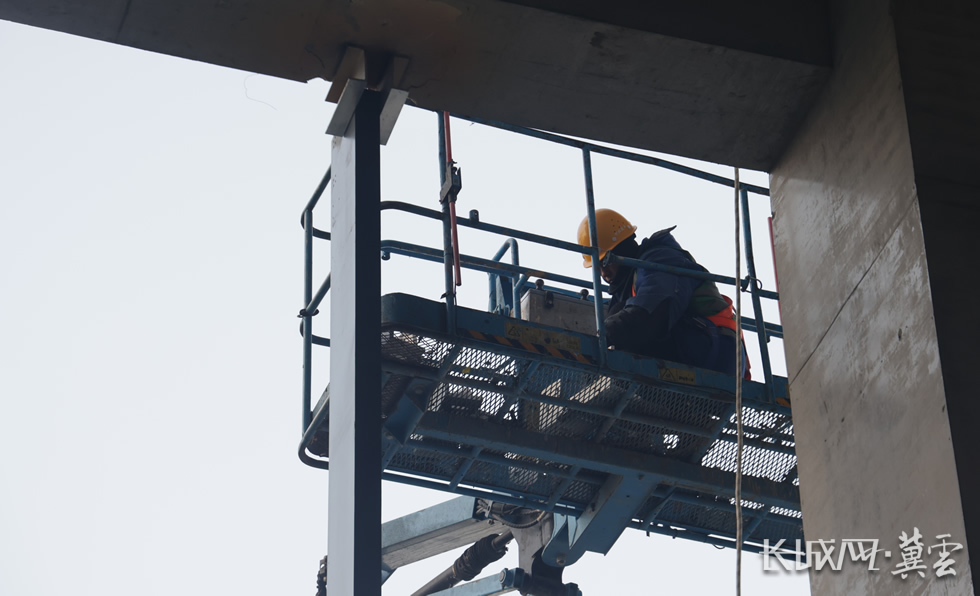 在高空作业平台上,工人正在对建筑底部的钢结构节点进行精准检测。春节期间,项目不停工,工人坚守岗位,严格把控幕墙安装的每一个细节,确保结构安全与施工精度,为“展形象”节点目标筑牢基础。张家浩 摄
