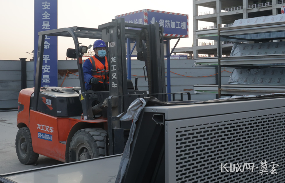 在材料堆放区,叉车工人正有序转运幕墙板材。春节期间,物料保障是施工推进的关键环节。工人们高效协作,将定制化的幕墙构件精准运至作业面,为玻璃幕墙的快速安装提供坚实支撑,全力冲刺节点目标。张家浩 摄