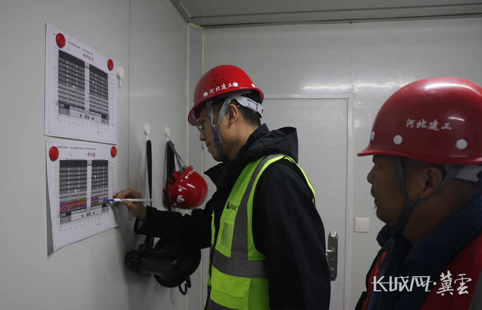 在施工现场办公室,管理人员正在研究施工进度,通过挂图作战的方式,细化每日施工任务。春节期间,项目团队将科学统筹,精准调度,确保幕墙安装各工序无缝衔接,以高效管理保障“展形象”节点目标顺利实现。张家浩 摄
