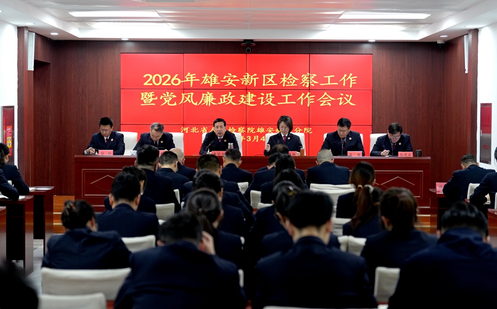 3月4日,2026年雄安新区检察工作暨党风廉政建设工作会议召开。会议深入贯彻落实全国、全省检察长会议和新区2026年工作会议、新区党工委政法工作会议,全省检察机关和新区党风廉政建设工作会议精神,聚焦加速实现雄安检察现代化,更好服务高标准高质量建设现代化城市,总结“十四五”时期工作,研究部署2026年任务。